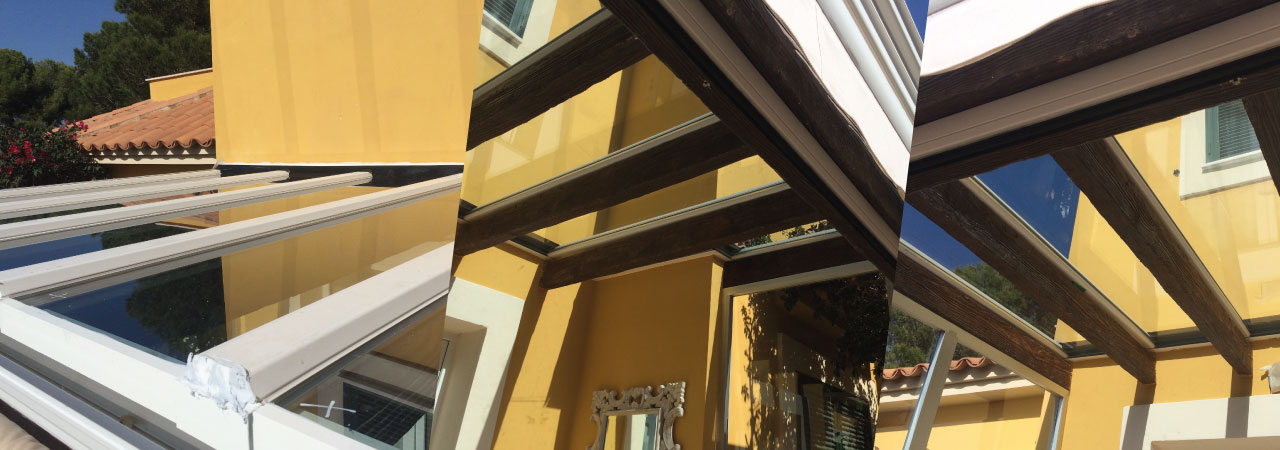 Moderno sistema de protección solar para invernaderos, jardines de invierno y terrazas cubiertas de cristal. Por medio de unas guías se desplaza la lona con una tensión continua. Este sistema debe estar obligatoriamente motorizado.